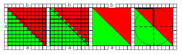 Que en dos dimensiones la representación gráfica perfecta de la suma de la progresión aritmética al cuadrado del sumando a, más la suma de la progresión aritmética al cuadrado del sumando b, es un cuadrado de valor igual a c² formado por dos triángulos rectángulos iguales tal y como se puede ver en el gráfico anterior. Ya que se puede verificar que es la ÚNICA representación gráfica que respecta todos los posibles e infinitos valores derivados de c: c/1, c/2, c/3, c/4, c/5, etc. en todos y cada uno de sus respectivos e infinitos puntos.